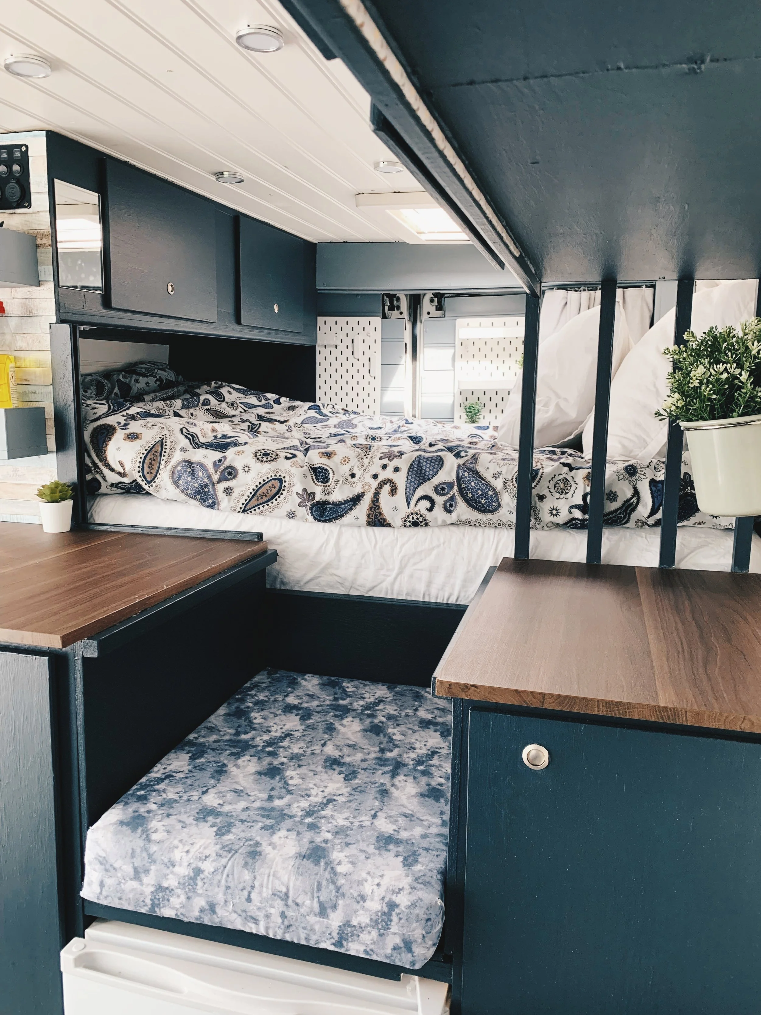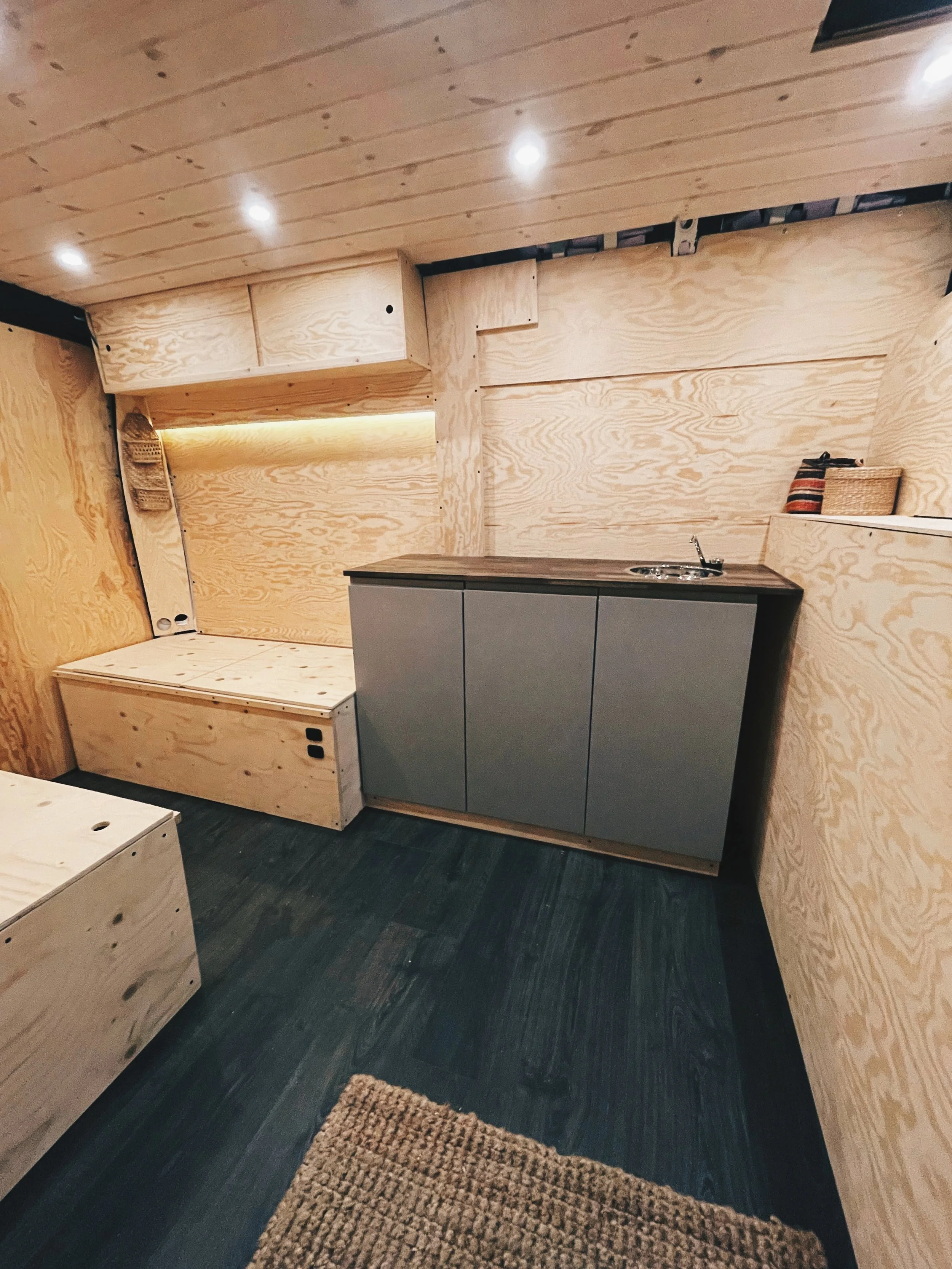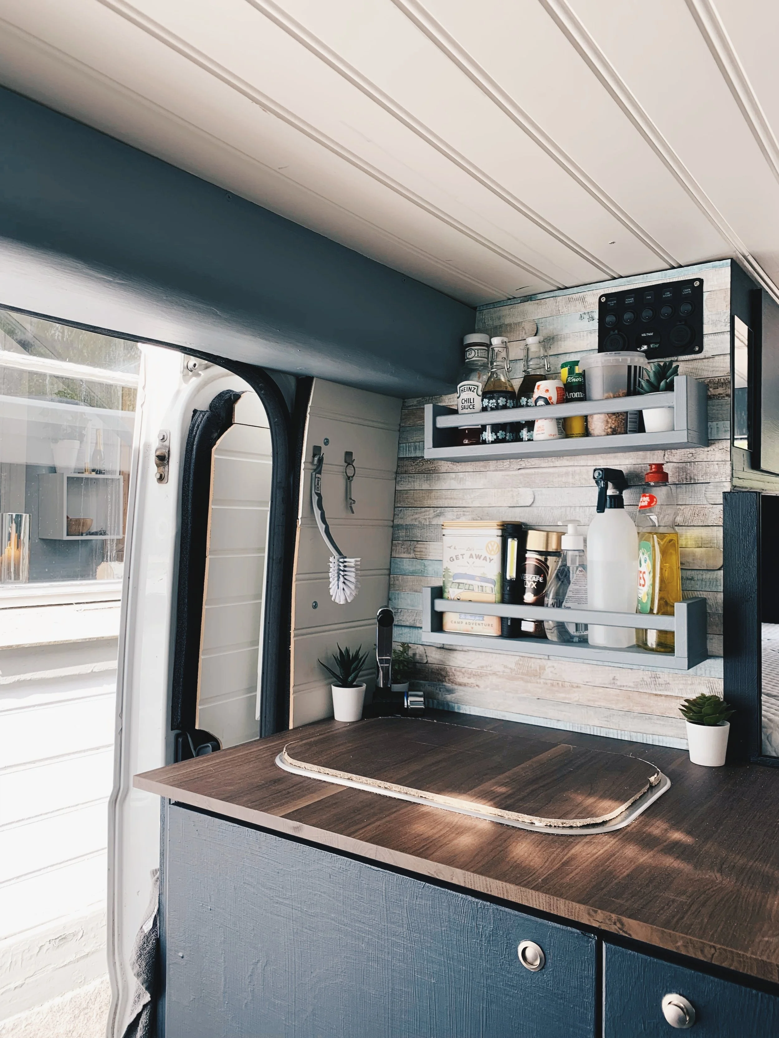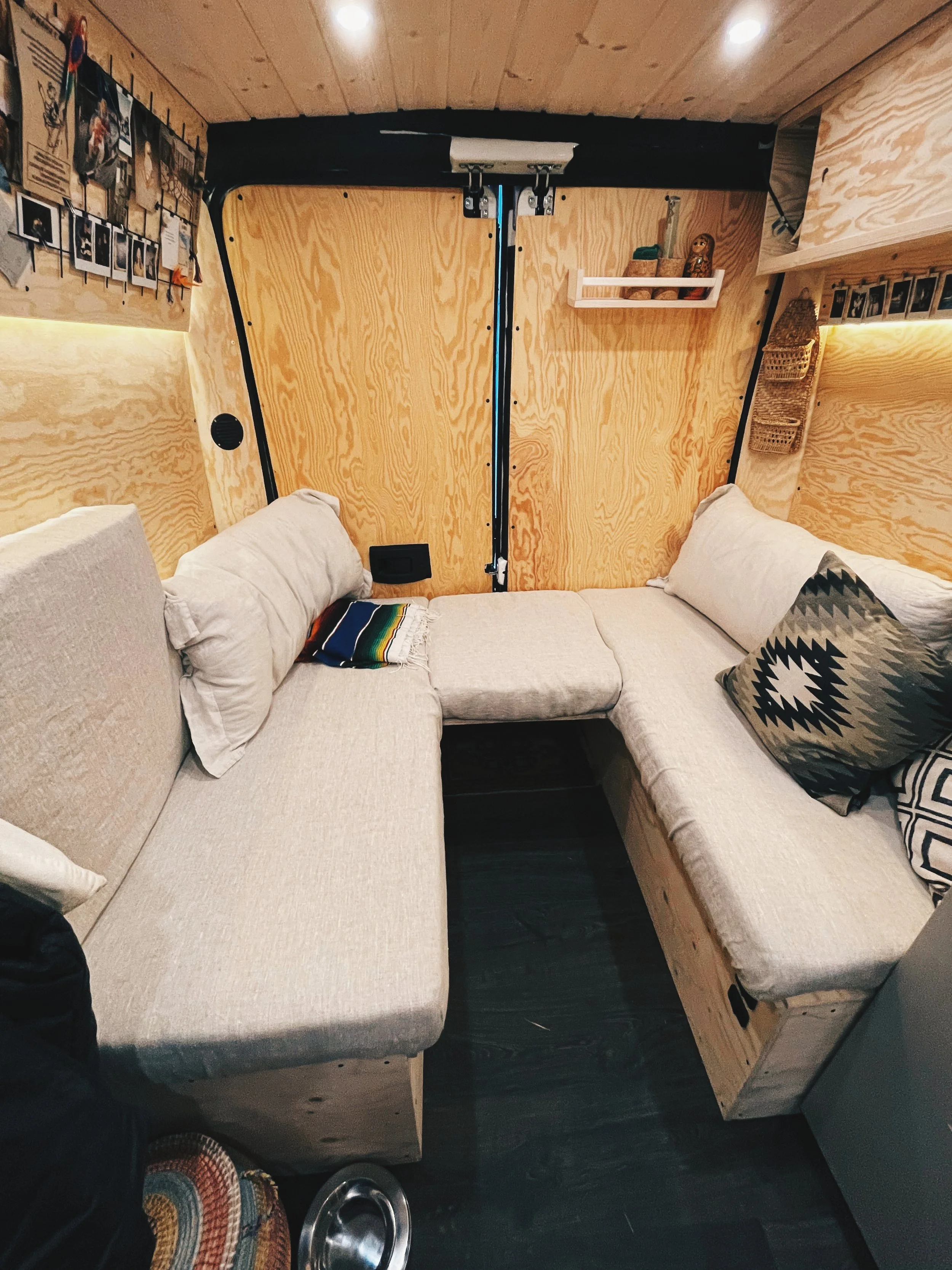 När Malin byggde sin van prioriterade hon någonting så ovanligt som stor golvyta. Anledningen var hennes två hundar som också skulle bo med henne på heltid. Till höger i den första bilden kan du också se Malins berömda cykelskåp, som är någonting utav det mest geniala vi har sett! Ett smalt skåp mot mellanväggen, som rymmer både två par skidor och en mountainbike. I överdelen har hon också en toppmatad låda med skafferi.