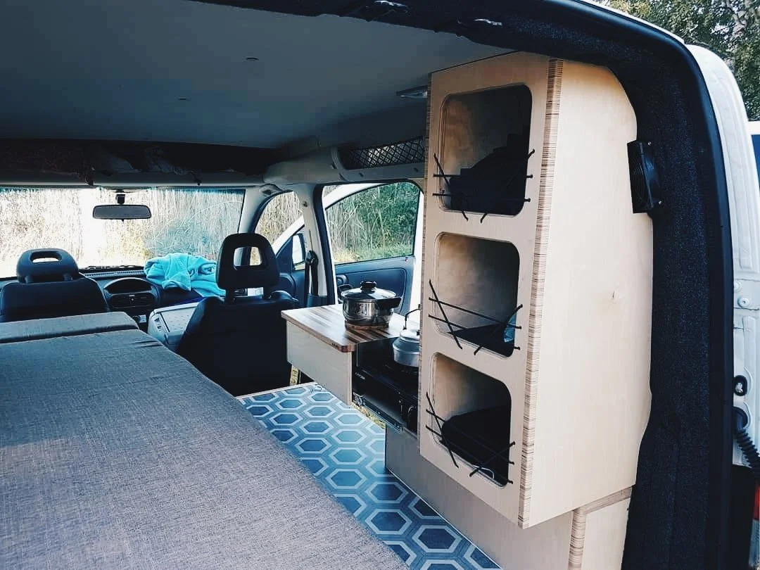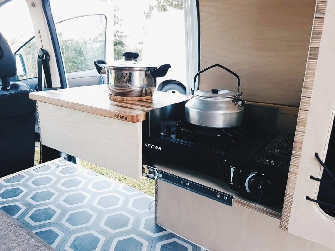 När Kristoffer-Robin skulle bygga sin minicamper var utgångspunkten “lyxigare tält”. Sängen är knappt bredare än ett liggunderlag och sådär irriterande avsmalnande i fotändan. För där skulle det ju få plats med en hylla och ett pyttelitet kök. Ett sätt att göra köket lite rymligare och samtidigt vinna lite plats, var att bygga denna finurliga lösning där köket förvaras under ett utdragbart arbetsbord.