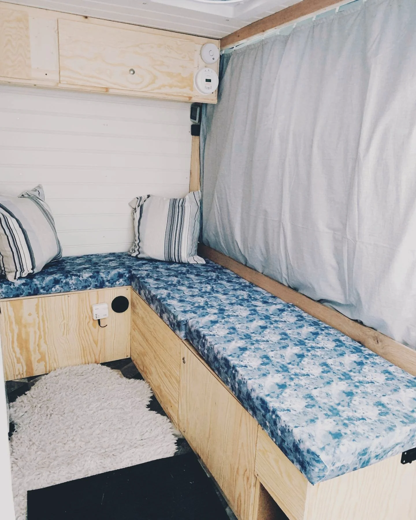 Linnea har valt att behålla soffan i framsätet och bygga en sittplats direkt där bakom, men det går fortfarande att klättra fram till förarhytten om en skulle vilja det. Vilket Linnea gör ganska ofta eftersom hon är för lat för att gå runt (enligt egen utsago alltså!). Gardinen som ni ser är en isolerad gardin som förhindrar kylan att läcka in.